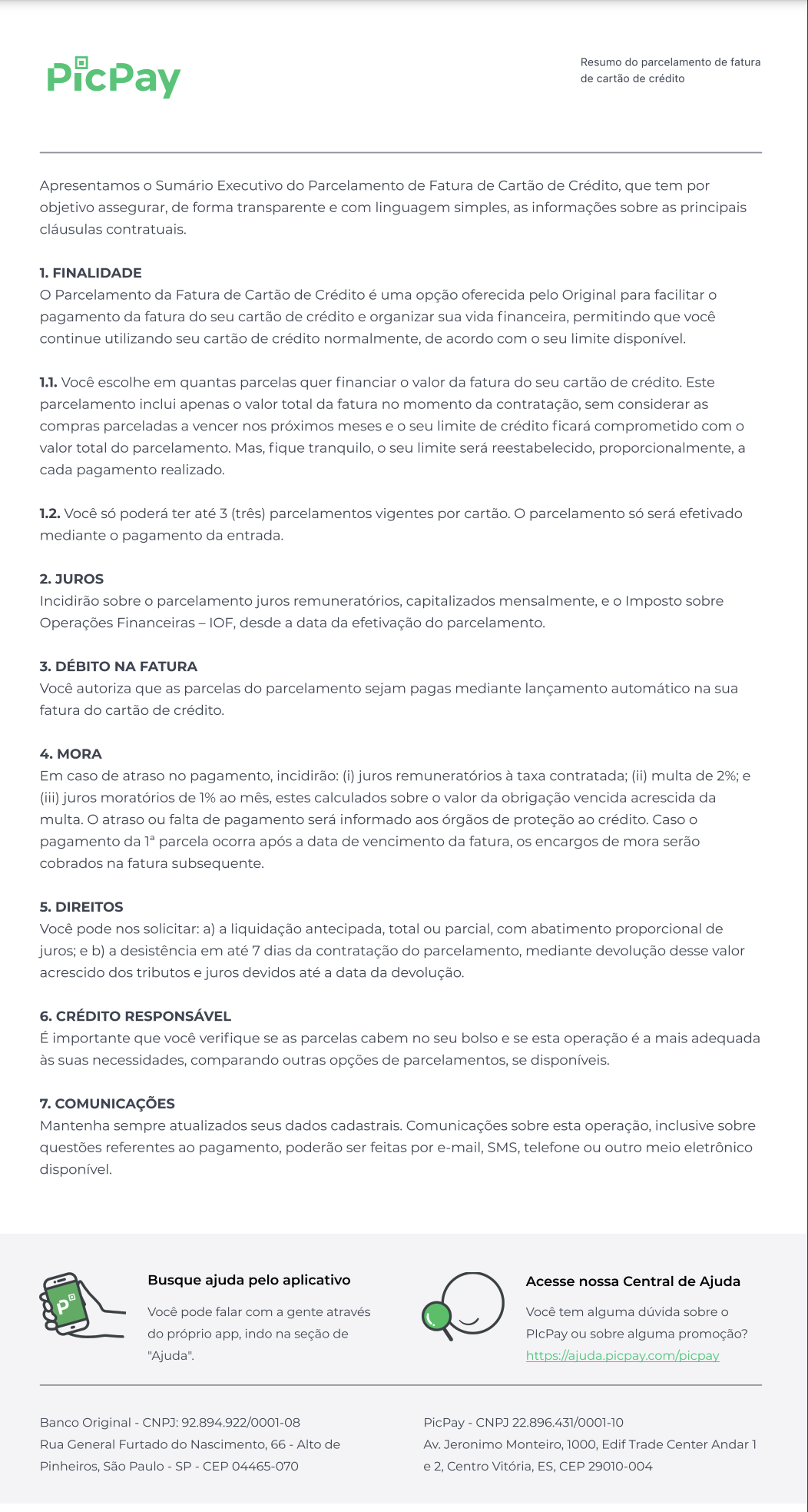 Você pode consultar o contrato do parcelamento da fatura do seu PicPay Card aqui mesmo. Confira: